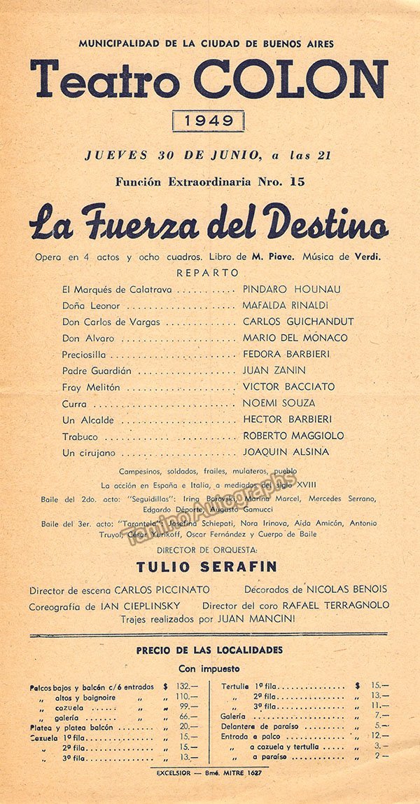 Playbill announcement for a performance of Verdi's La Forza del Destino at Teatro Colon, Buenos Aires, Argentina, 1949; starred by Mario Del Monaco, Mafalda Rinaldi and Carlos Guichandut, under the baton of Tullio Serafin. Size is 6.25 x 11.9 inches, central fold, in excellent condition.