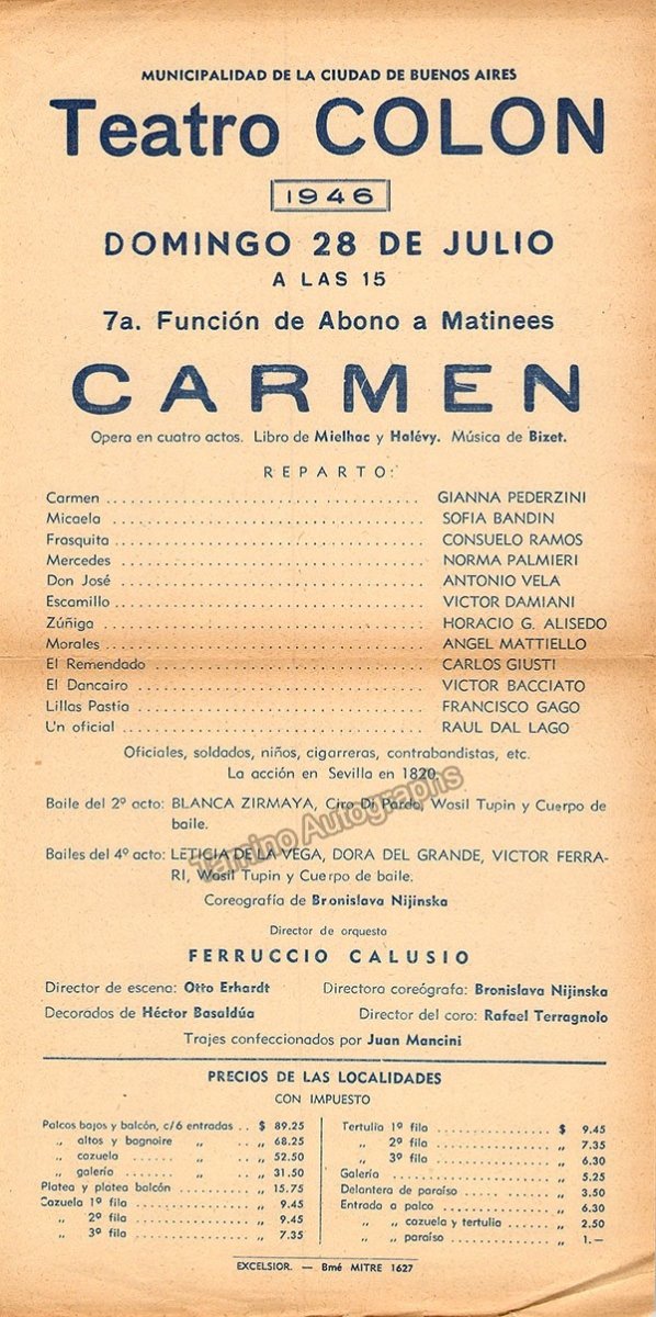 Playbill announcement for a performance of Bizet's Carmen at Teatro Colon, Buenos Aires, Argentina, 1946; starred by Gianna Pederzini, Sofia Bandin, Antonio Vela and Victor Damiani, under the baton of Ferruccio Calusio. Size is 6.25 x 12.5 inches, central fold, in very good condition.