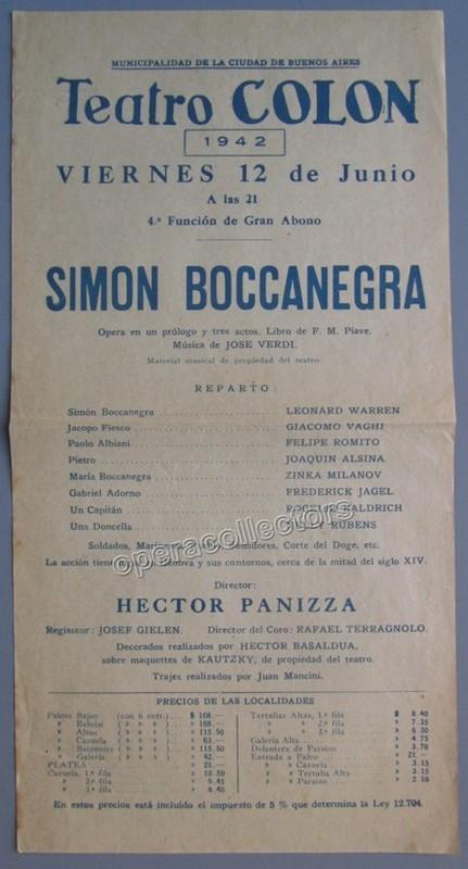 Playbill announcement for a performance of Verdi's Simon Boccanegra at Teatro Colon, Buenos Aires, Argentina, 1942; starred by Zinka Milanov, Giacomo Vaghi and Leonard Warren, under the baton of Ettore Panizza.