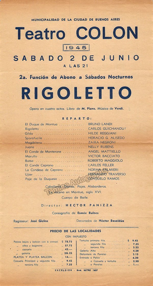 Playbill announcement for a performance of Verdi's Rigoletto at Teatro Colon, Buenos Aires, Argentina, 1945; starred by Carlos Guichandut, Bruno Landi, Hilde Reggiani, under the baton of Ettore Panizza. Size is 6.5 x 12.25 inches, central fold, rust stains, otherwise in very good condition.