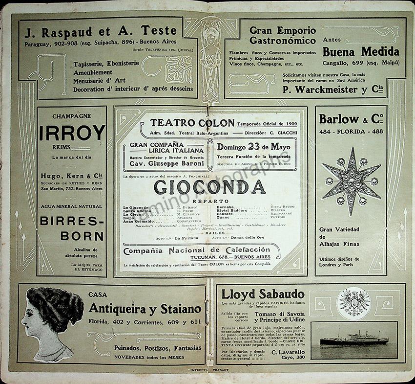 Performance of La Gioconda, May 23rd, 1909, with Eugenia Burzio, Florencio Constantino and Titta Ruffo.