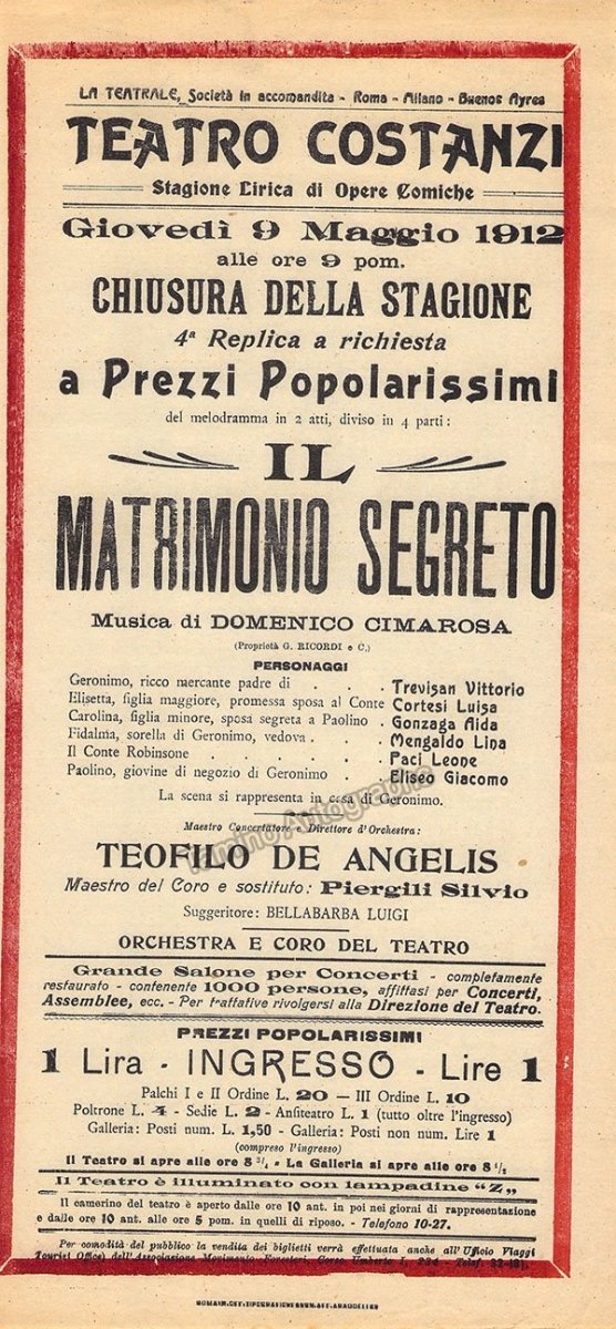Playbill for a performance of Cimarosa's Il Matrimonio Segreto on May 9th 1912, at Teatro Costanzi, Rome, with Vittorio Trevisan and Luisa Cortesi, conducted by Teofilo De Angelis. Size is 6.4 x 13.1 inches, in excellent condition.