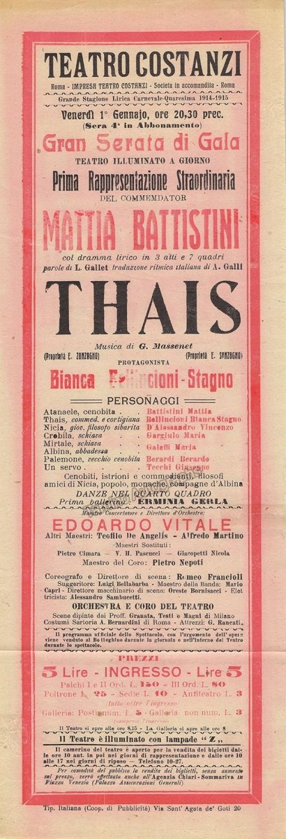 Playbill for a performance of Massenet's Thaïs on January 1st, 1915, at Teatro Costanzi, Rome, with Mattia Battistini and conducted by Edoardo Vitale. Size is 6.5 x 18.9 inches, folds, in excellent condition.