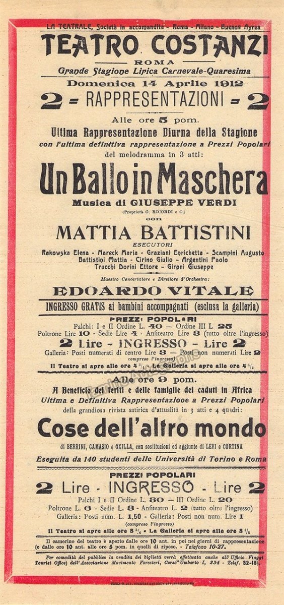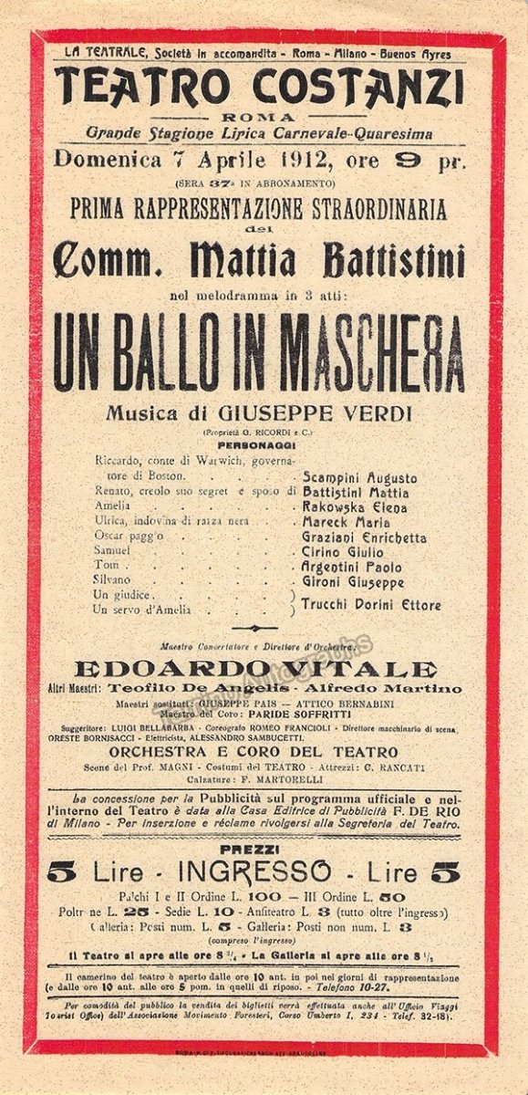 Playbill for a performance of Verdi's Un Ballo in Maschera on April 14th, 1912, at Teatro Costanzi, Rome, with Mattia Battistini as Renato and conducted by Edoardo Vitale. Size is 6.25 x 13.1 inches, in excellent condition.