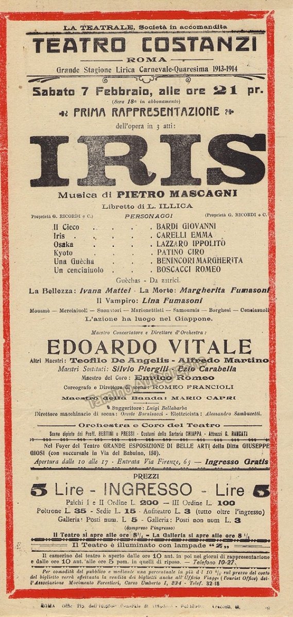 Playbill for a performance of Mascagni's Iris on February 7th, 1914, at Teatro Costanzi, Rome, with Ema Carelli and Hipolito Lazaro in the leading roles, conducted by Edoardo Vitale. Size is 6.25 x 12.75 inches, in excellent condition.