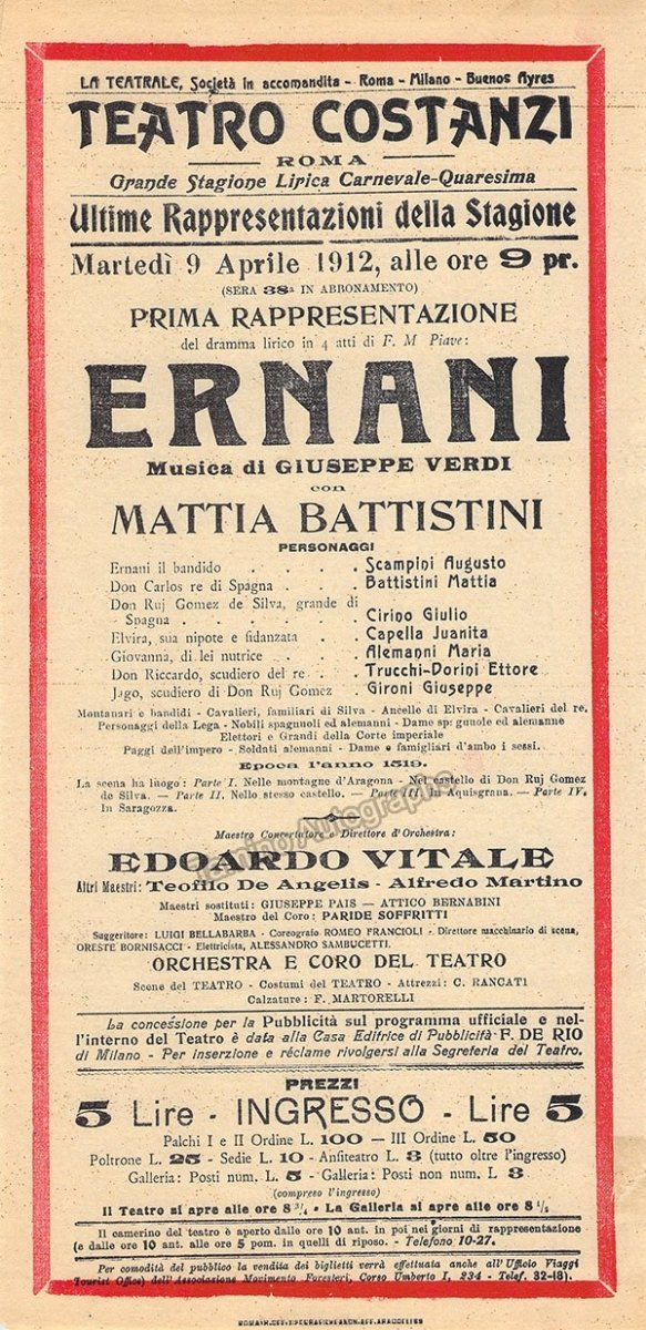 Playbill for a performance of Verdi's Ernani on April 2nd, 1912, at Teatro Costanzi, Rome, with Mattia Battistini and conducted by Edoardo Vitale. Size is 6.3 x 13.1 inches, in excellent condition.