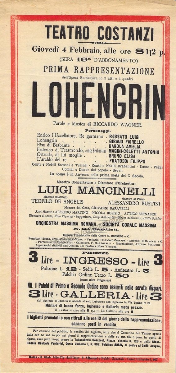 Playbill for a performance of Wagner's Lohengrin (sung in Italian) on February 4th, ca.1915, at Teatro Costanzi, Rome, conducted by Luigi Mancinelli. Size is 6.6 x 13.75 inches, in excellent condition.