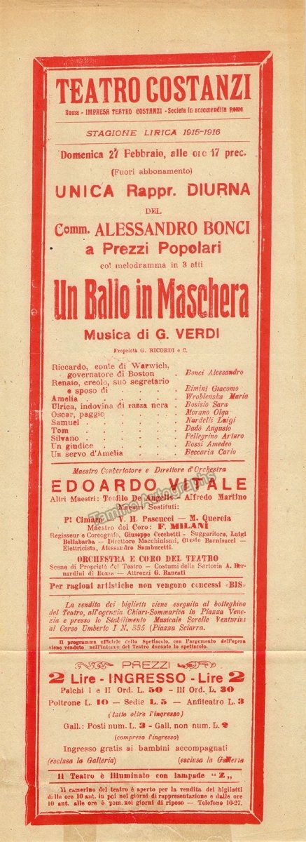 Playbill for a performance of Verdi's Un Ballo in Maschera on February 24th, 1916, at Teatro Costanzi, Rome, with Alessandro Bonci as Riccardo, Giacomo Rimini as Renato and conducted by Edoardo Vitale. Size is 6.75 x 20.2 inches, stains over upper border, folds, in very good condition.
