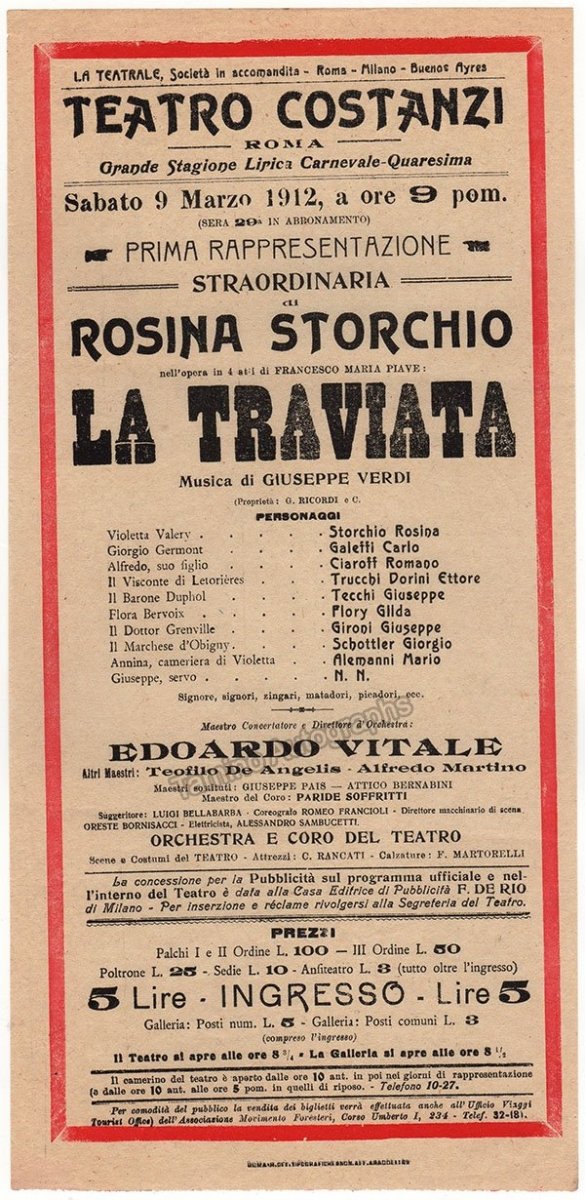 Playbill for a performance of Verdi's La Traviata on March 9th, 1912, at Teatro Costanzi, Rome, with Rosina Storchio in the title role and conducted by Edoardo Vitale. Size is 6.25 x 13.1 inches, in excellent condition.
