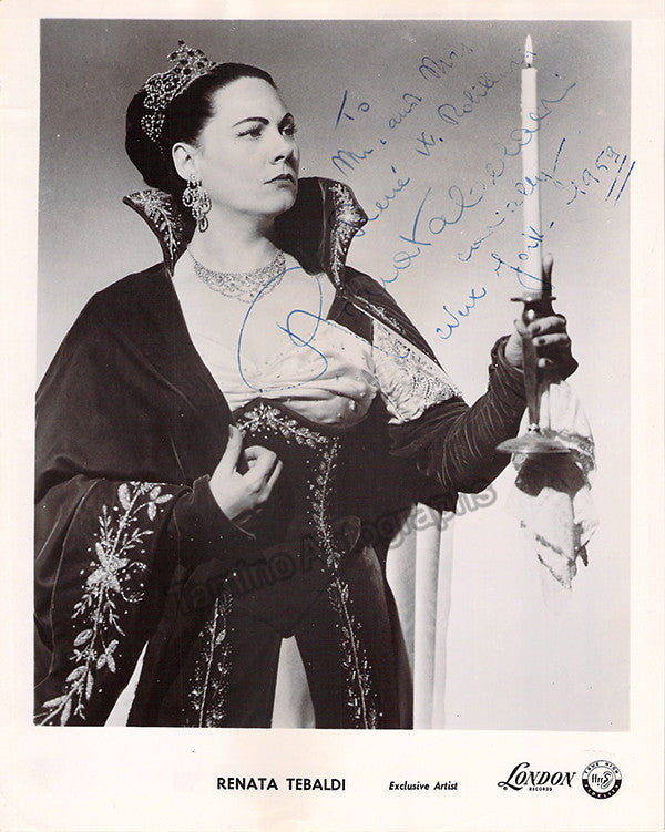 Italian soprano (1922-2004), signed promo photo, shown in the title role in Tosca. Inscribed and dated in 1959, in New York. Size is 8 x 10 inches