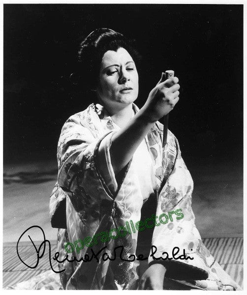 Superstar italian soprano (1922-2004), extremely famous for her large, voluminous voice and tonal beauty. She primarily focused on verismo roles and the lyric dramatic repertoire. Signed photo, shown in the title role of Puccini´s opera "Madama Butterfly", 8x10 inches.