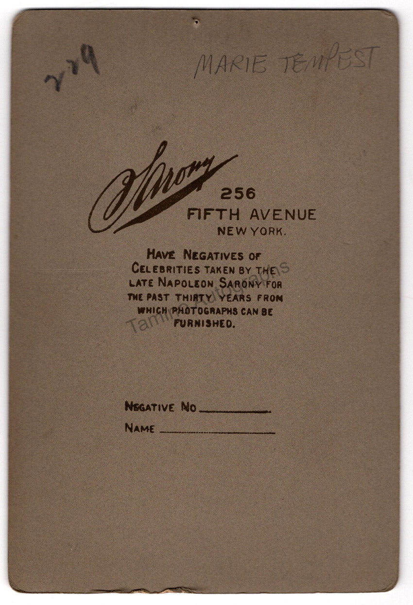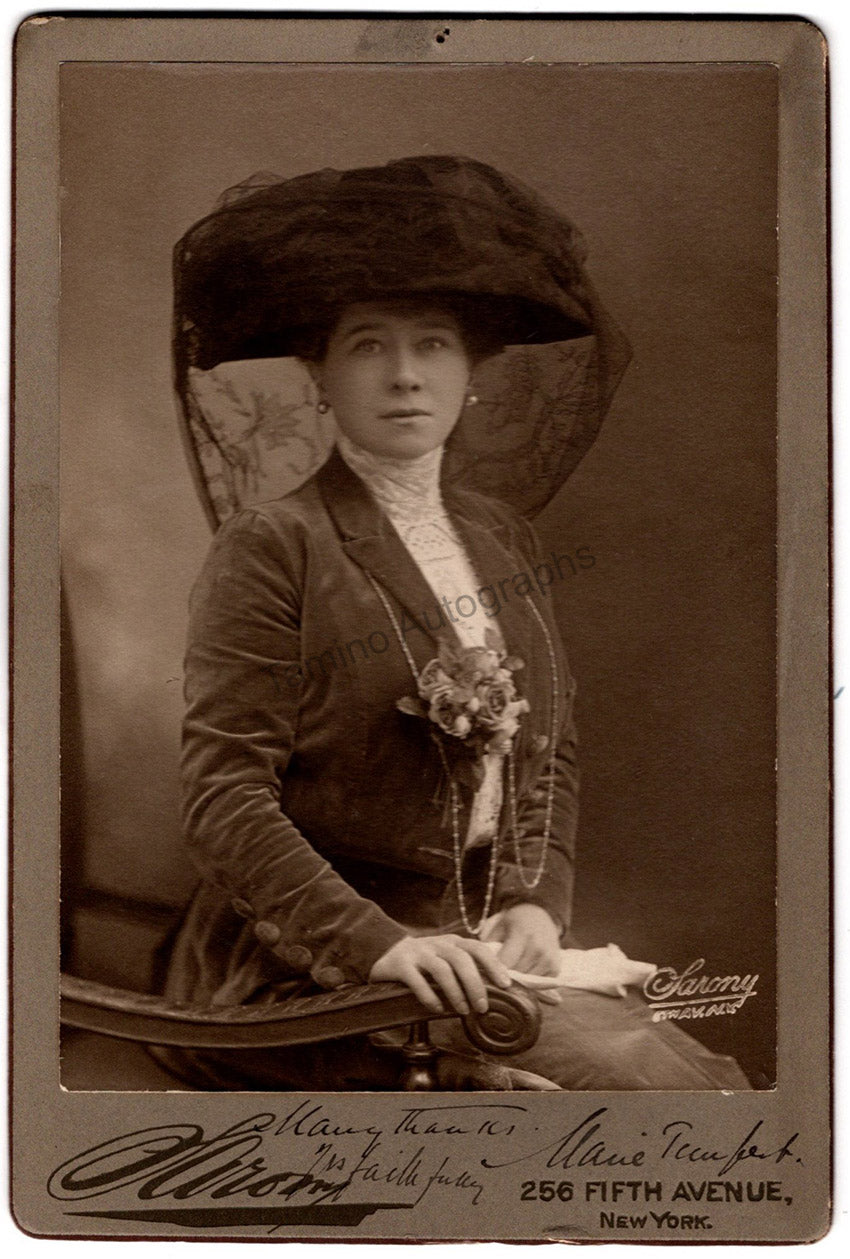 Fantastic cabinet photograph by Sarony (New York) signed by Mrs. Tempest.  Size is 4.4 x 6.5 inches, pinhole over the upper border, marks on verso, in excellent condition.