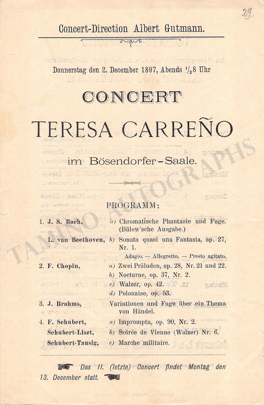 Unsigned concert program for a performance of works by Bach, Beethoven, Chopin, Brahms, and others, by the celebrated Venezuelan pianist in Vienna on December 2, 1897.