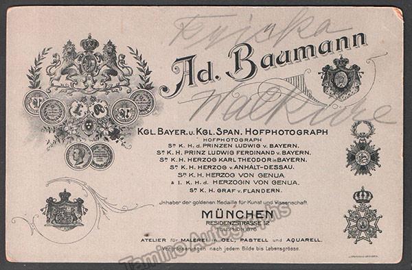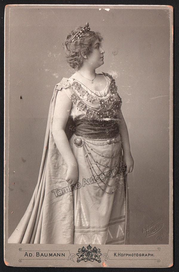 Croatian soprano (1863-1941), unsigned cabinet photo, shown as Fricka in Walkure. Photo by Adolf Baumann, Munich. Blind stamp by him on front in 1905. Some handwriting on pencil, by another person. Size is 4.25 x 6.5 inches, in very good condition.