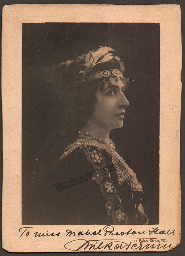 Croatian dramatic soprano (1863-1941), signed photograph, shown in role, inscribed. This is a 4.25 x 6.25 inch photo mounted on solid cardboard cabinet-style backing, total item size is 6.25 x 7.75 inches, slightly trimmed cardboard on bottom right, otherwise in very good condition. Vintage historical item!