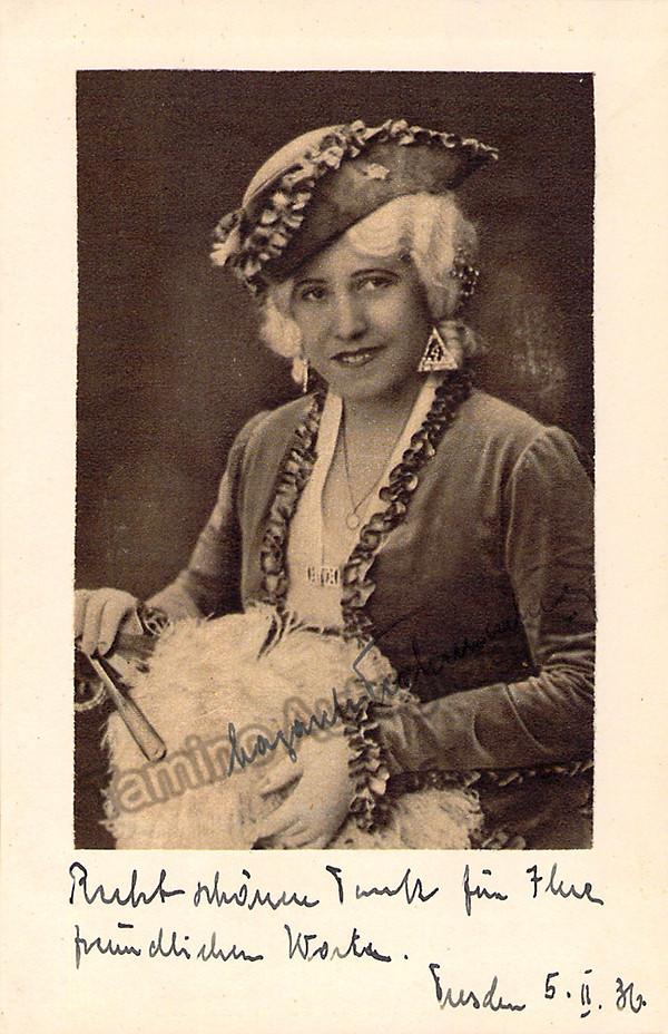 German soprano (1903-1959), signed card attached with a half-tone photo, shown as herself, dated in 1936, Dresden. Size is 3.5 x 5.5 inches.