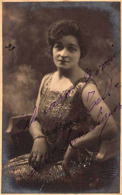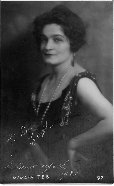 Signed postcard photograph, shown as herself, inscribed. Blind stamped by photographer Dersti, Turin. Size is 3.5 x 5.25 inches, some silvering, otherwise in excellent condition.