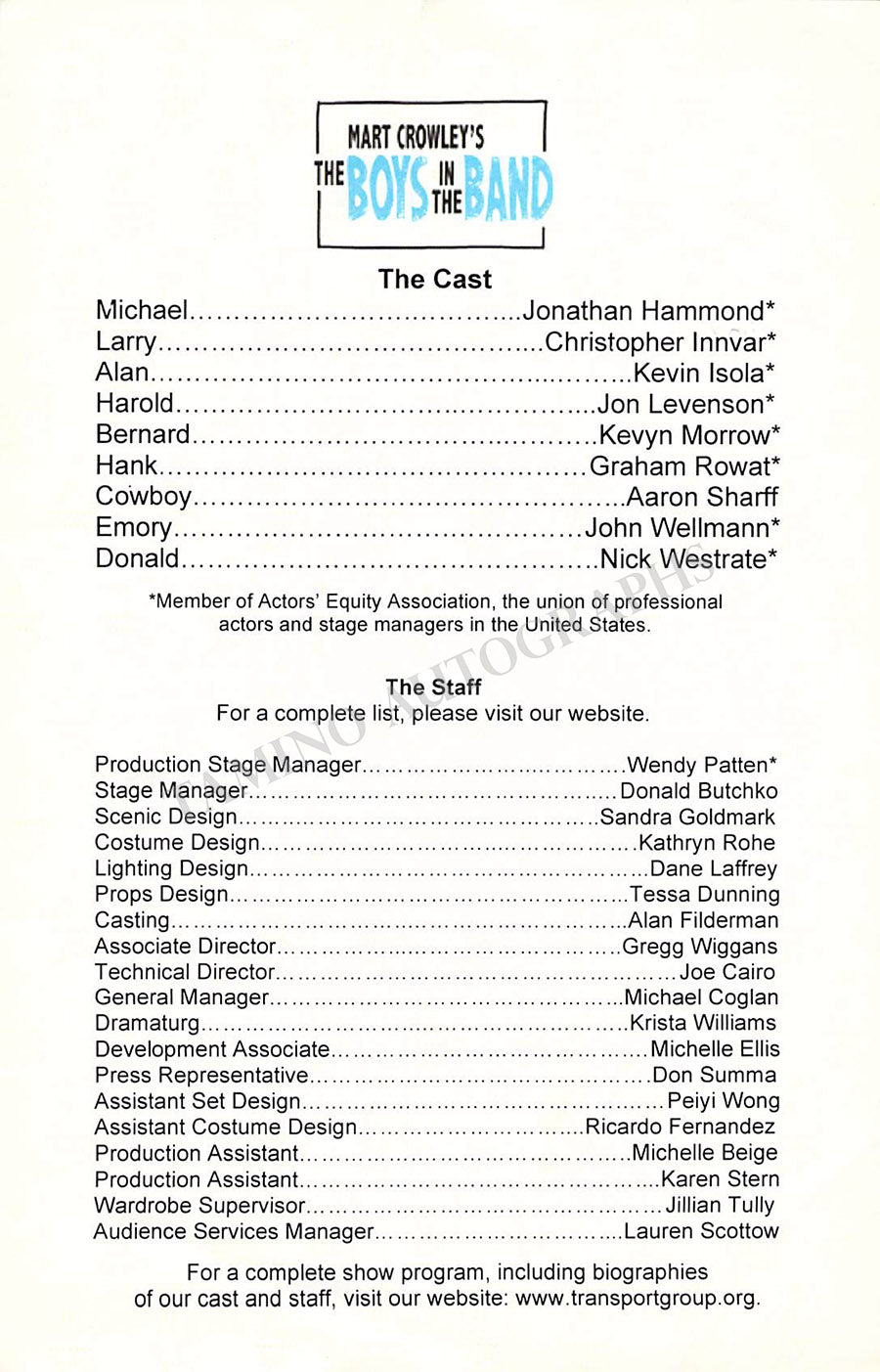 Original program for a Broadway production of Mart Crowley 1968's play The Boys in the Band in New York, signed by Jonathan Hammond, Kevin Morrow, Christopher Innvar, Jon Levenson, and some others.
