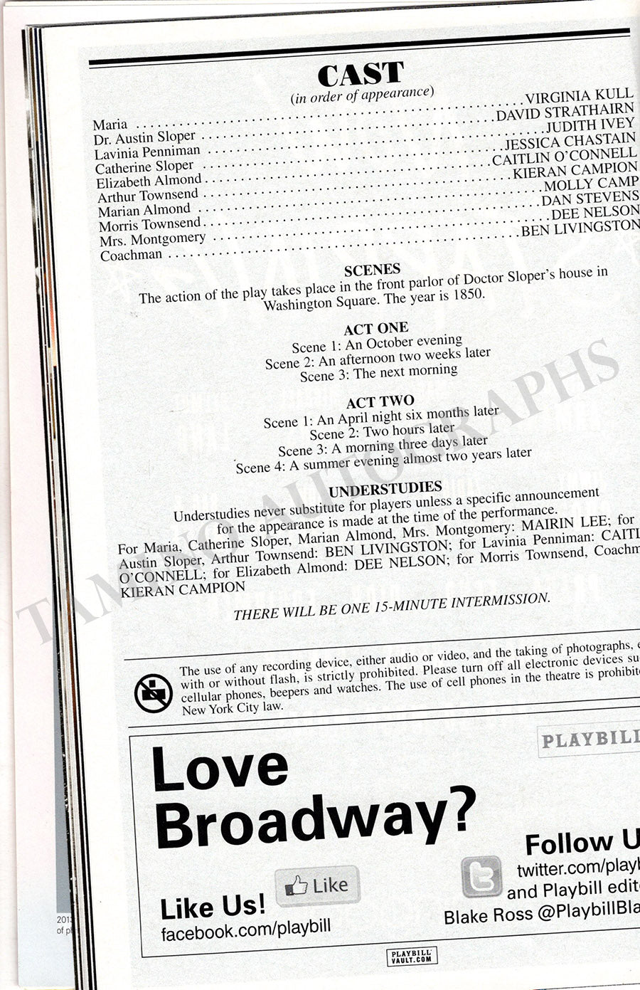 Original playbill for a Broadway production of the musical The Heiress at Walter Kerr Theatre; featuring Virginia Kull, David Strathairn, Judith Ivey, Jessica Chastain, and others; signed by most members of the cast.