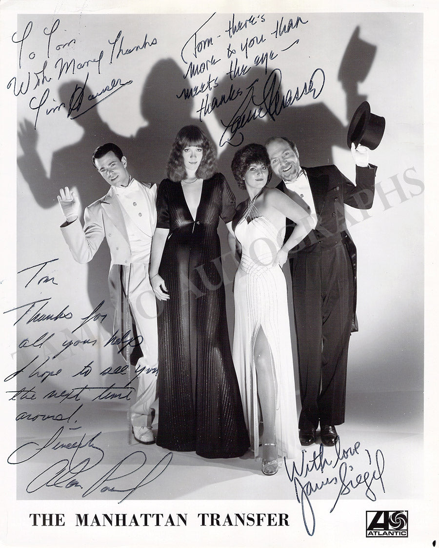 Fine black-and-white promotional photograph of the band by Atlantic signed and inscribed by members Janis Siegel, Laurel Massé, Tim Hauser, and Alan Paul. Size is 8 x 9.9 inches, in very good condition.