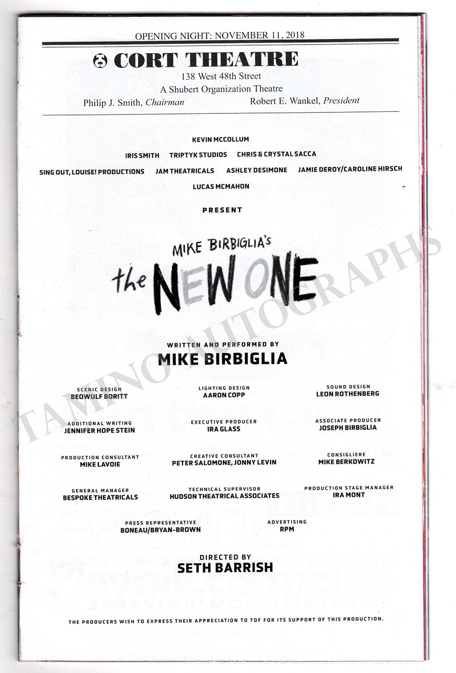 Original playbill for a Broadway production of Mike Birbiglia's musical The New One at Cort Theatre, featuring Mike Birbiglia, Iris Smith, Kevin McCollum, and others; signed by Mike Birbiglia.