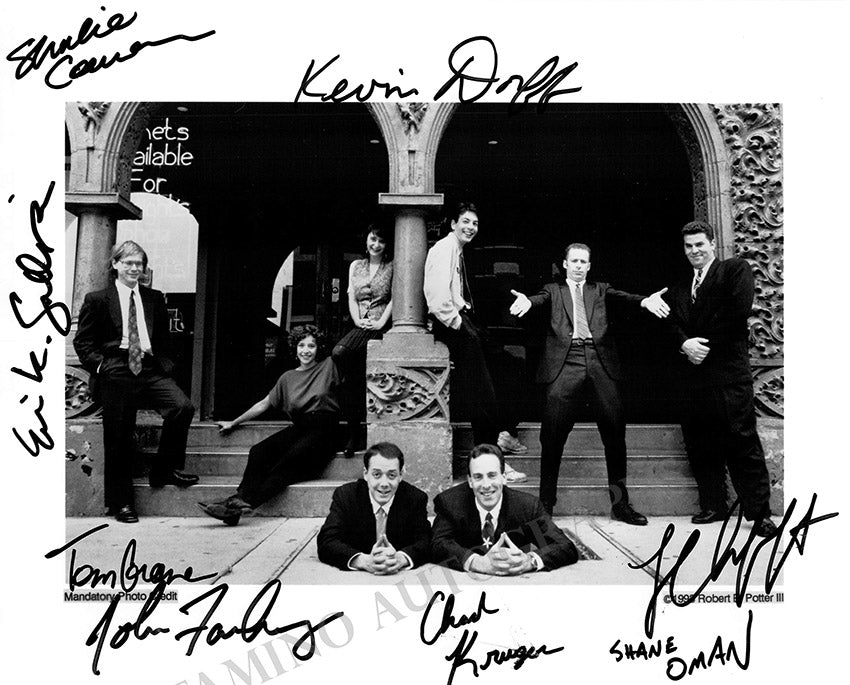 Fine black-and-white promo photograph signed by 8 members including Michael Broh, Jennifer Bill, Rachel Pratch, Chad Krueger, Jon Glaser, Jeff Rogers, Mark Dalbis, and Joe Dempsey.  Size is 9.9 x 8 inches, in excellent condition.