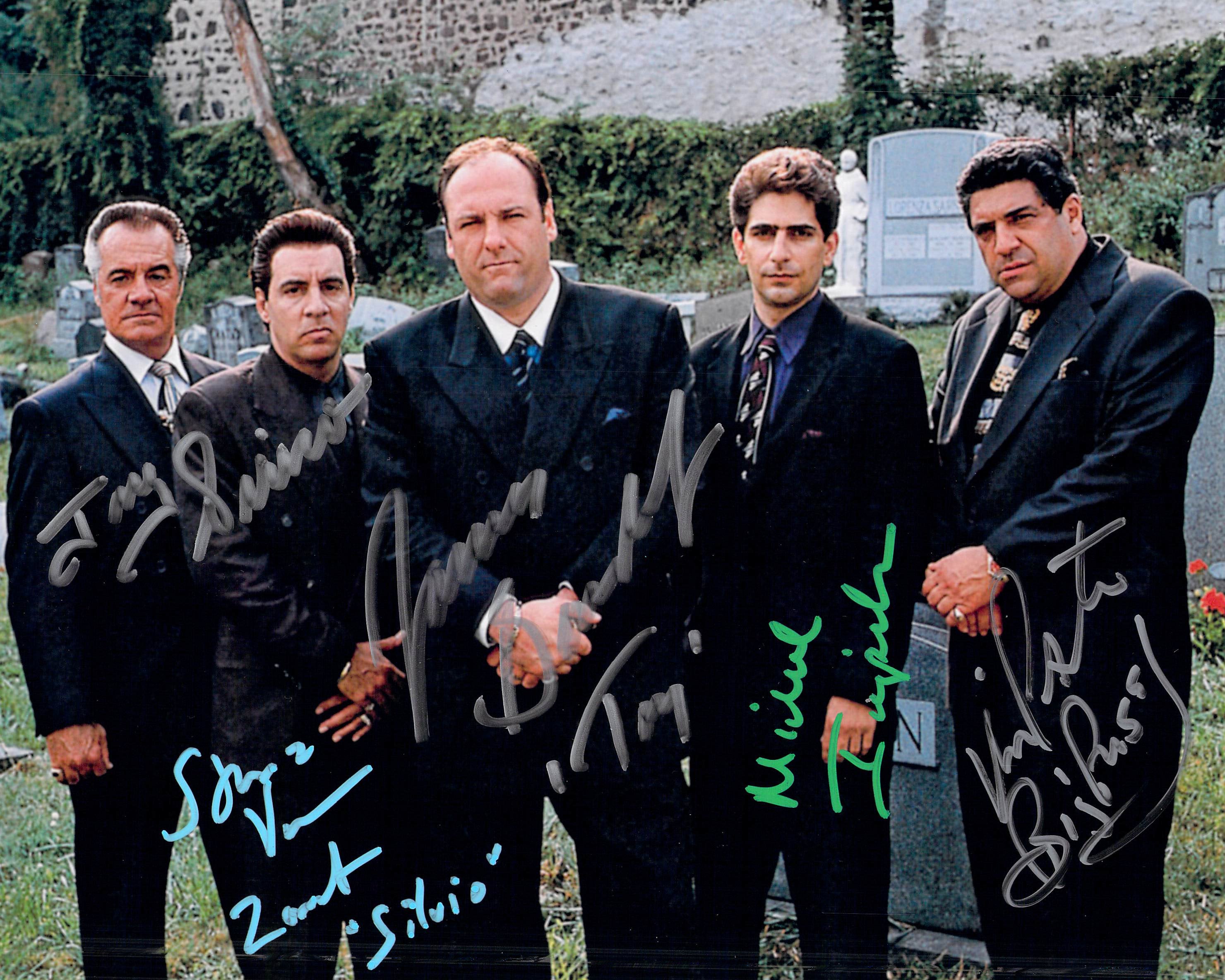Fine photograph signed by the 5 most important male characters, (left to right): Tony Sirico, Steven Van Zandt,  James Gandolfini, Michael Imperioli, and Vincent Pastore.  Size is 9.9 x 8 inches, in excellent condition.