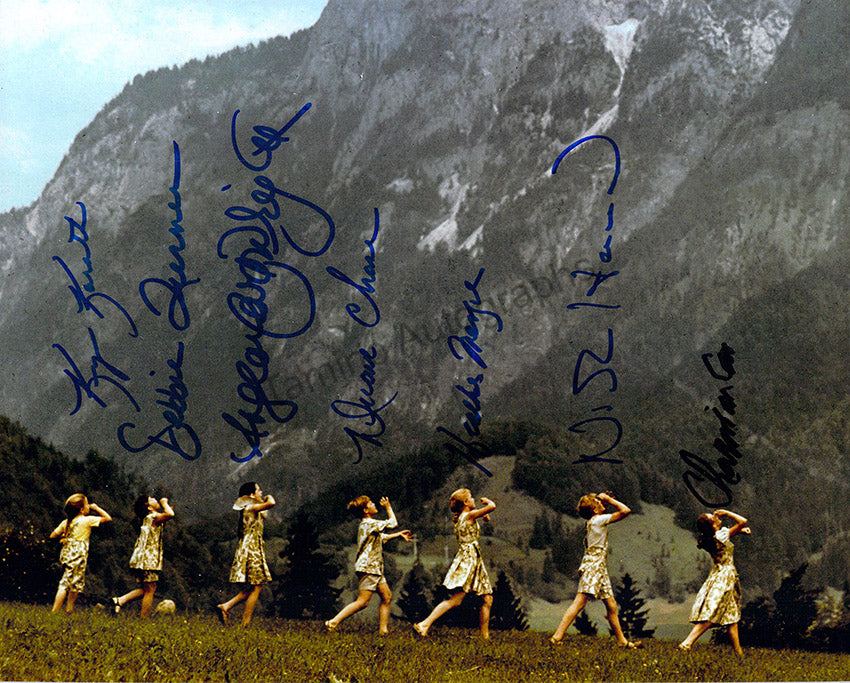 Stunning color movie-still photograph signed by all 7 von Trapp children: Heather Menzies (Louisa), Duane Chase (Kurt), Angela Cartwright (Brigitta), Debbie Turner (Marta), Kym Karath (Gretl), Charmian Carr (Liesl), Nicholas Hammond (Friedrich).  Size is 9.9 x 8 inches, in excellent condition.