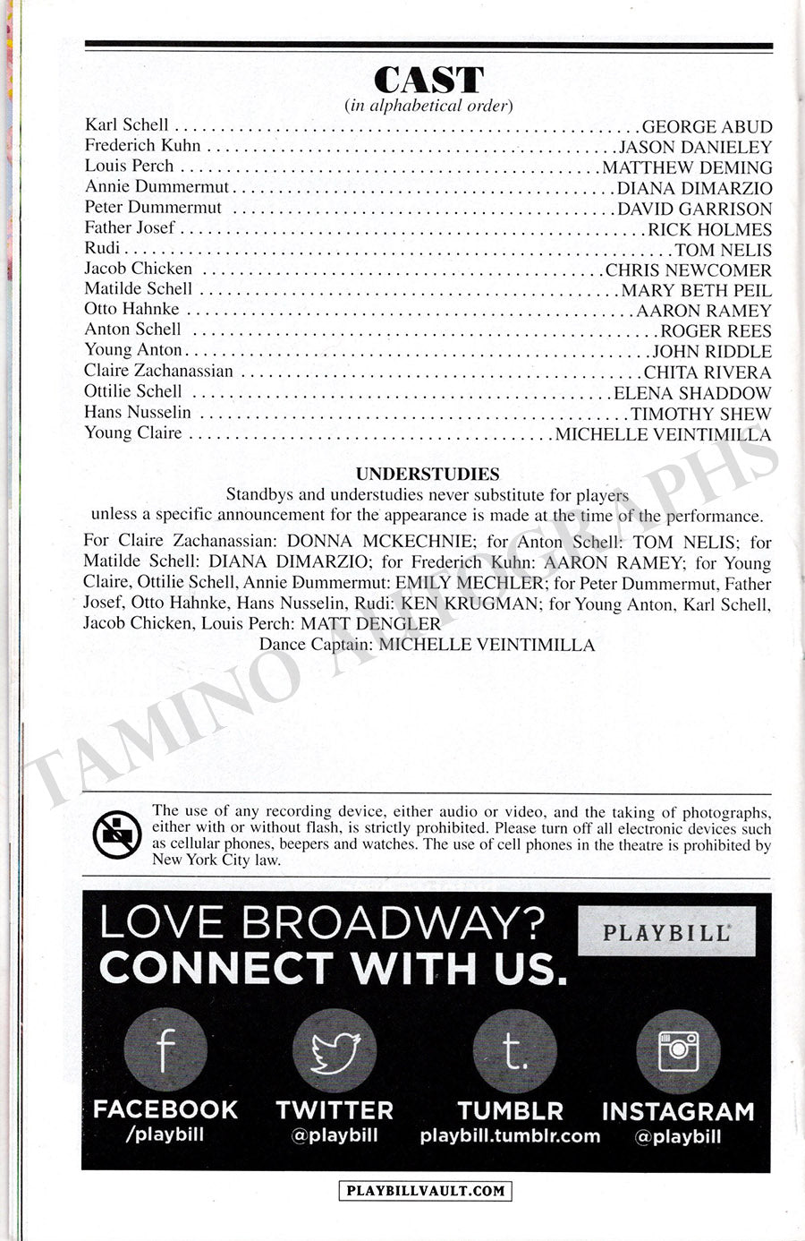 Original playbill for a Broadway production of John Kander's musical The Visit at Lyceum Theatre; featuring George Abud, Jason Danieley, Matthew Deming, Diana Dimarzio, David Garrison, and others; signed by some members of the cast.