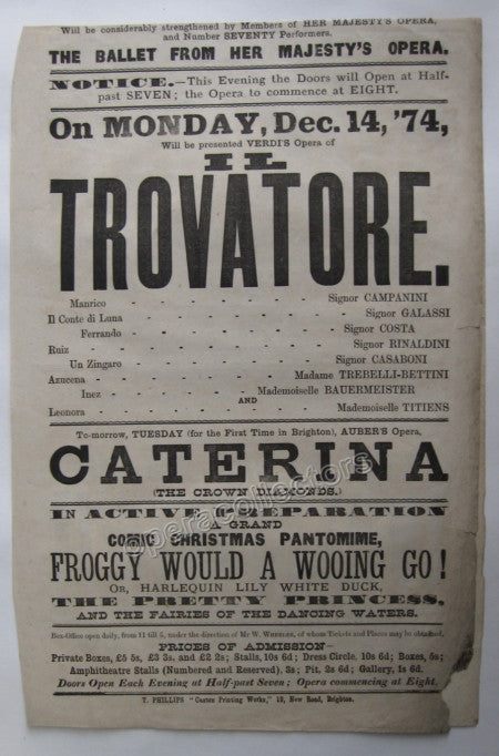 Beautiful original playbill from Theatre Royal Opera House in Brighton, England, announcing a performance of Il Trovatore. Cast singers include some famous names such as german soprano Mathilde Bauermeister (1849-1926) as Leonora and italian tenor Italo Campanini (1849-1896) as Manrico. Very large size, 30 x 9.75 inches!. In excellent condition, folded in the center.
