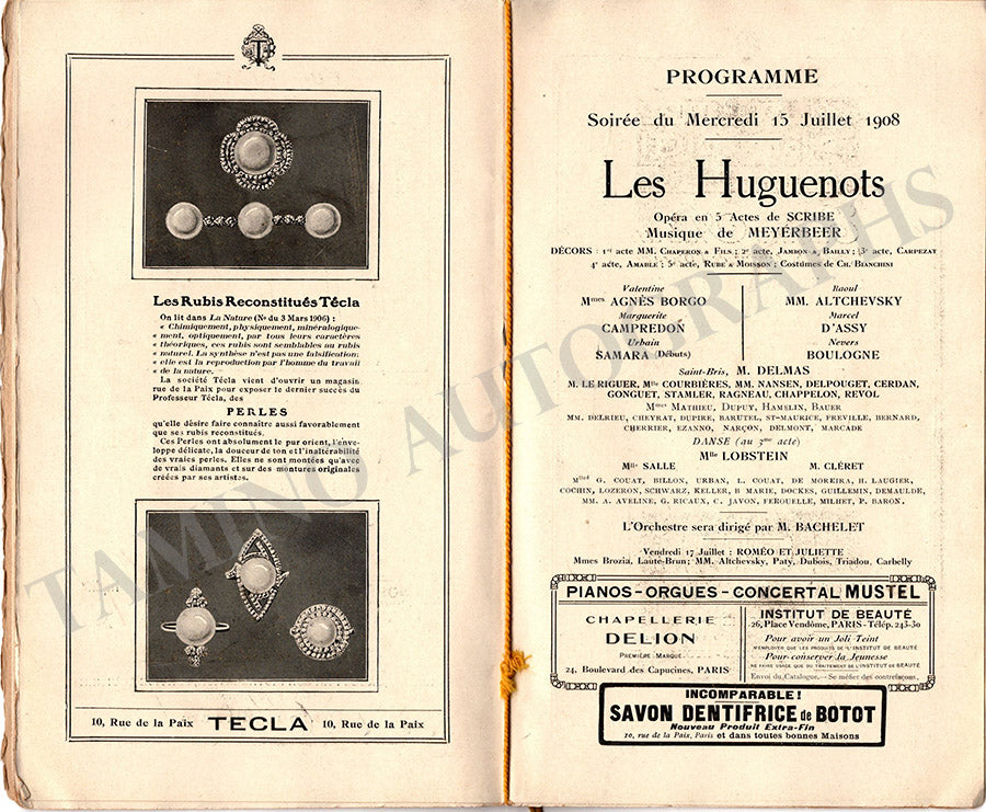 Original vintage program for a performance of Meyerbeer's opera Les Huguenots at the Theatre National de L'Opera de Paris, 1908, featuring Agnes Borgo, Campredon, Altchevsky, Boulogne, under the baton of M. Bachelet.