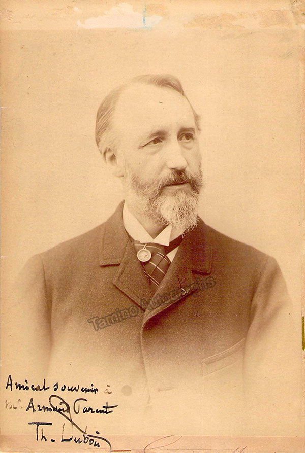 Fine sepia photograph signed by him with a short sentiment.  Size is 3.8 x 5.75 inches, mounting traces on top (probably cut from an album page), in very good condition.