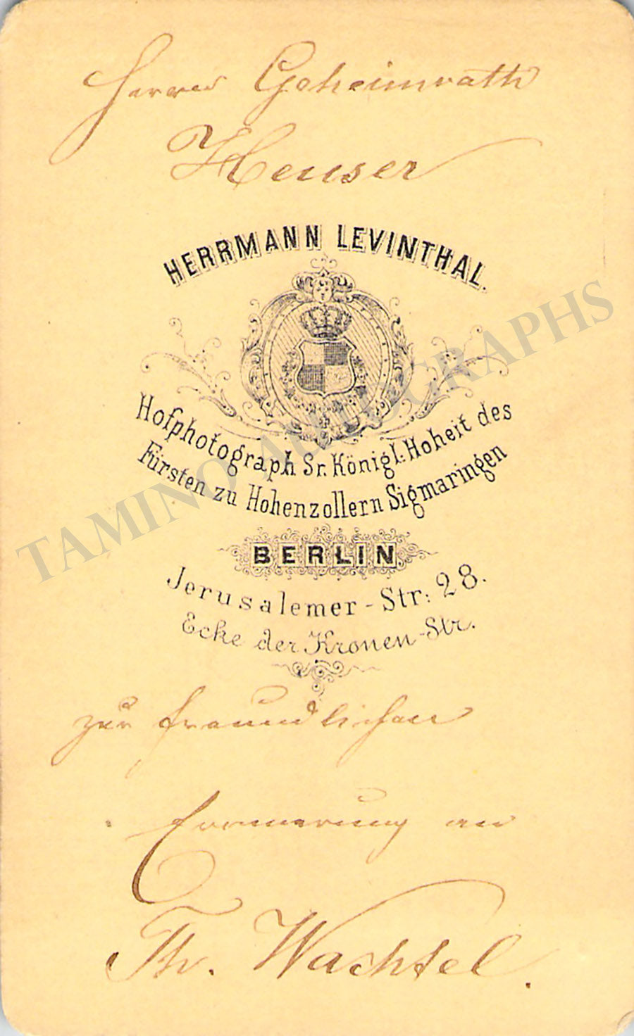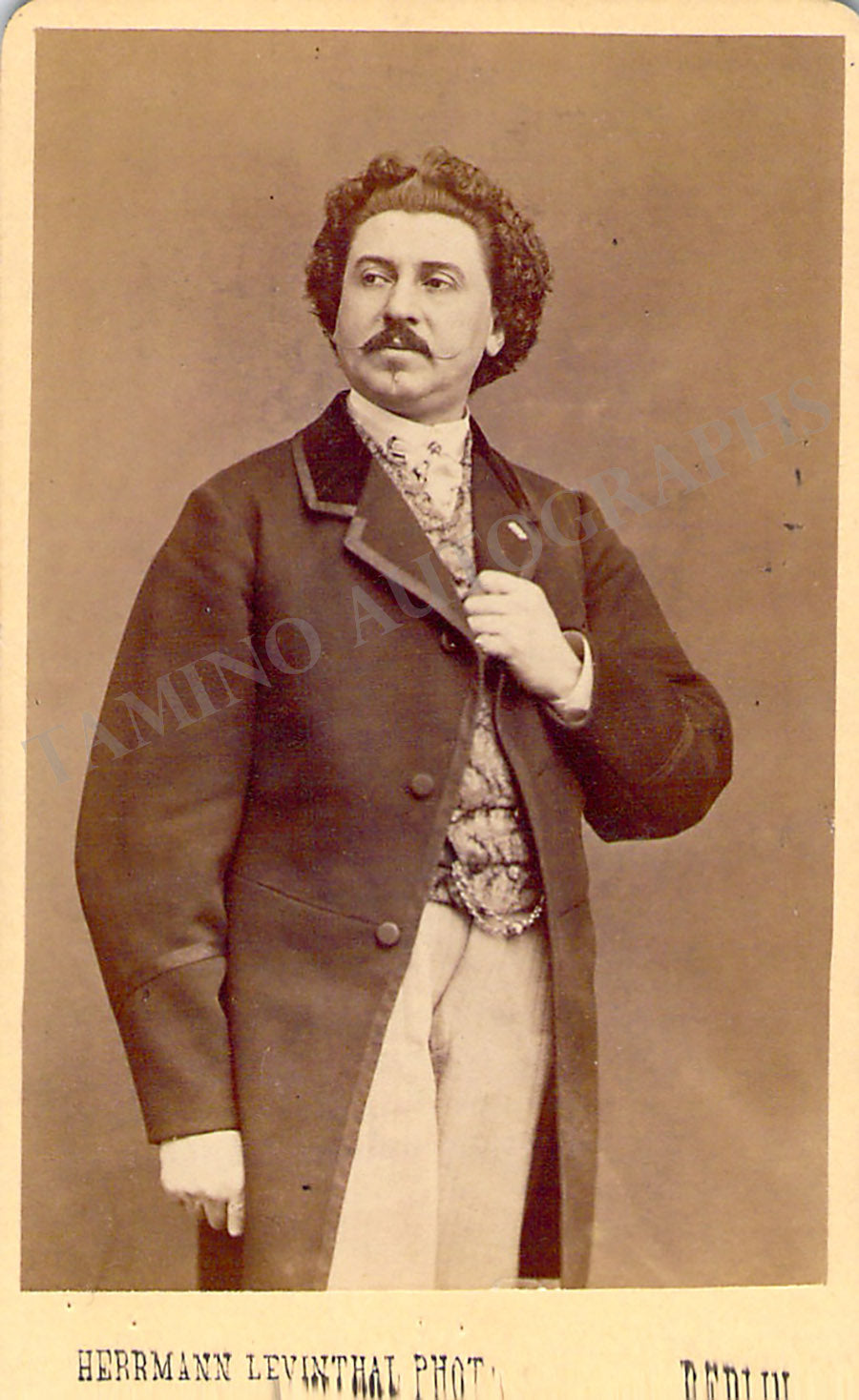 Very nice carte-de-visite (CDV) vintage photo of the tenor by photographer Hermann Levinthal (Berlin), signed and inscribed on verso by Wachtel. Size is 2.3 x 3.9 inches, in excellent condition.