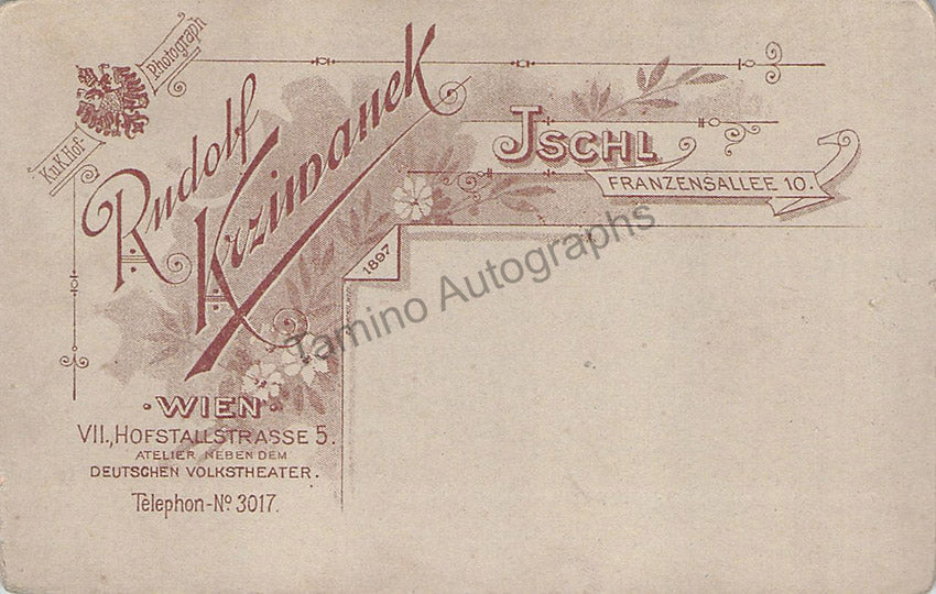 Beautiful mini-cabinet photograph signed by him, shown young; an original by Rudolf Krziwanek, Vienna. Size is 2.6 x 4.2 inches, in excellent condition.