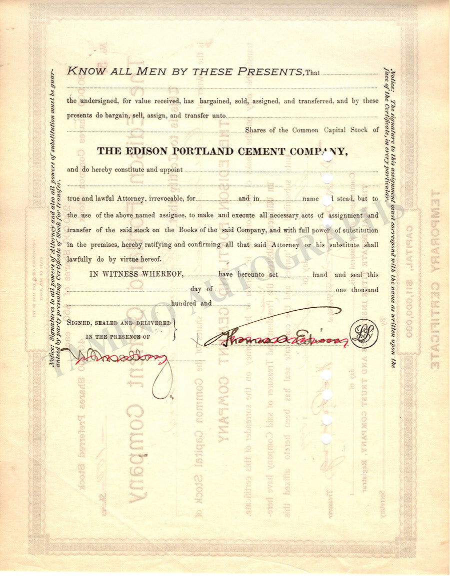 1,000 stock shares certificate for The Edison Portland Cement Company signed on verso by the famous American inventor; the paper tab indicates it was issued on June 30, 1899. Size is 11.5 x 8.6 inches, red ink overwriting on the signature, otherwise in very good condition.