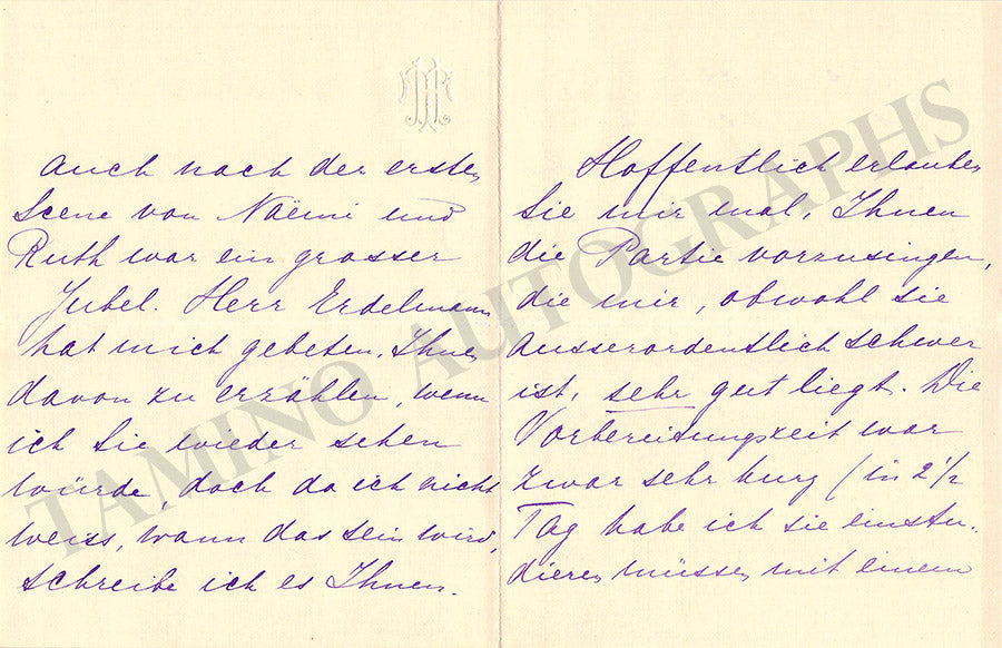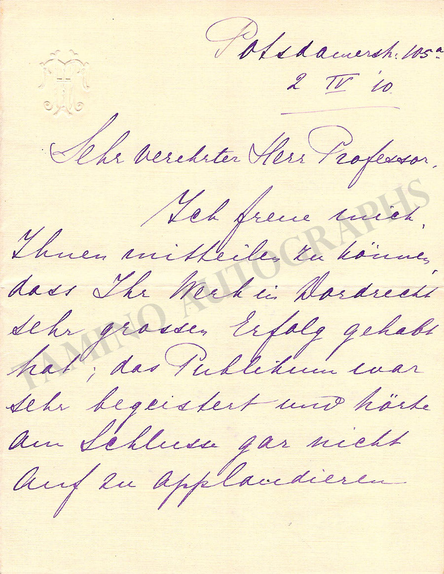 Autograph letter in German signed by her, dated April 2, 1910, to the composer Georg Schumann (1866-1952), concerning the performance of his opera “Ruth” in Dordrecht :
