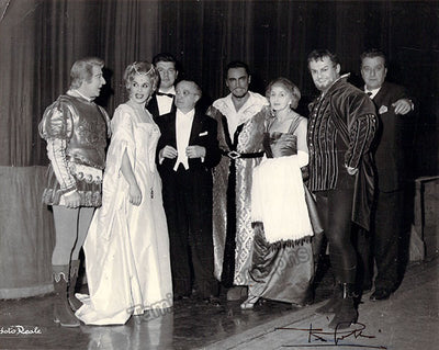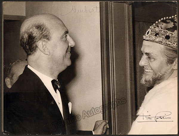 Signed photograph, shown backstage in Lisbon in 1955 in the costume of Verdi's Simon Bocanegra, shown with Umberto di Savoia, son of King Vittorio Emanuele III, at one time the Crown Prince of Italy. Size is 9 x 11.75 inches, in very good condition.