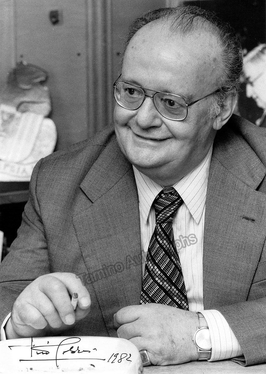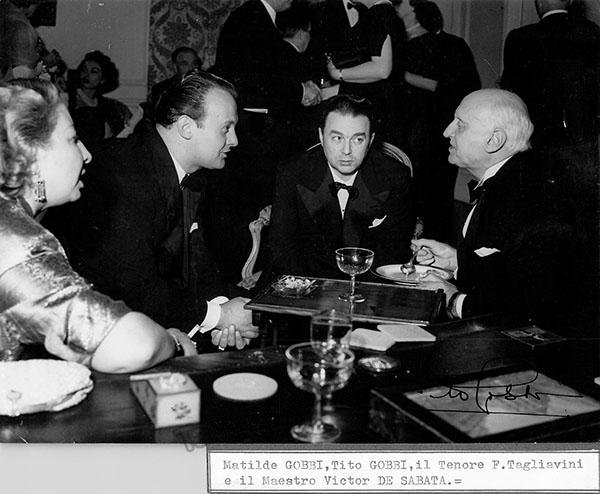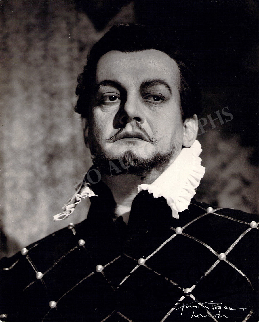 Signed photograph, shown backstage in the costume of Iago in Verdi's Otello with the conductor and other cast members following a performance at the Rome Opera. Photo by Foto Reale photographers. Size is 7 x 9 inches, small tear at the very bottom of the photo and mounting traces on verso, otherwise in very good condition.
