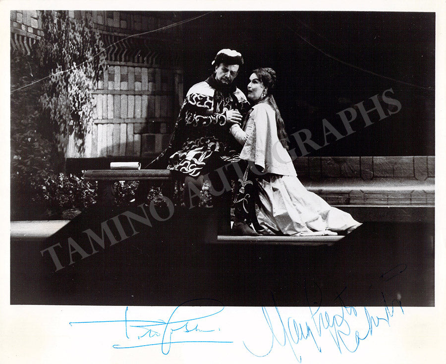 Signed photograph, shown in role (possibly Verdi's Simon Bocanegra) with an unidentified performer. Stamped on verso by photographer Nancy Sorensen, Lyric Opera of Chicago. Size is 8 x 10 inches, mounting traces on verso, otherwise in excellent condition.