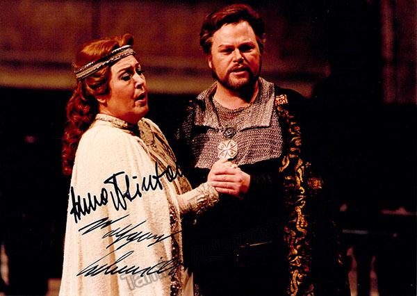 Bulgarian soprano (b. 1941) and German tenor (b.1956), double signed photo, shown in roles in Wagner's Tannhauser. Size is 5 x 7 inches, in excellent condition.