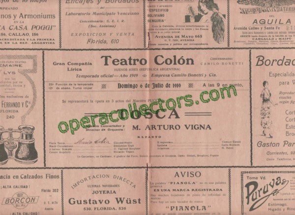 TOSCA - July 6th, 1919. Teatro Colon program with Gigli, Claudia Muzio is in the cast but couldn?t sing that night