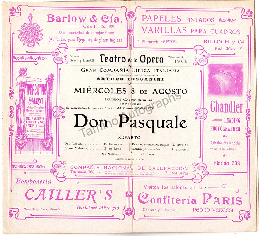 Unsigned program for a performance of Donizetti's Don Pasquale at Teatro de la Opera, a production by Gran Compania Lirica Italiana in Buenos Aires, August 8th, 1906, under the baton of the celebrated Italian conductor, with a luxurious cast including Renato Ercolani Giuseppe De Luca, Giuseppe Anselmi, and Rosina Storchio.