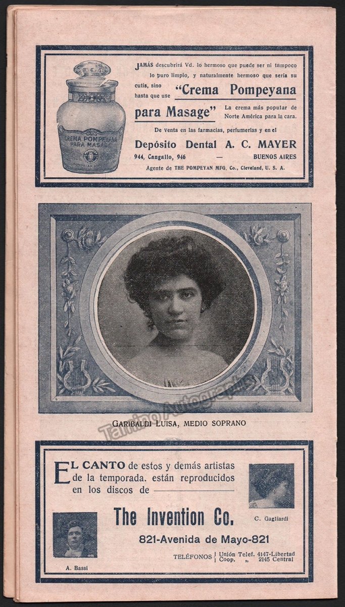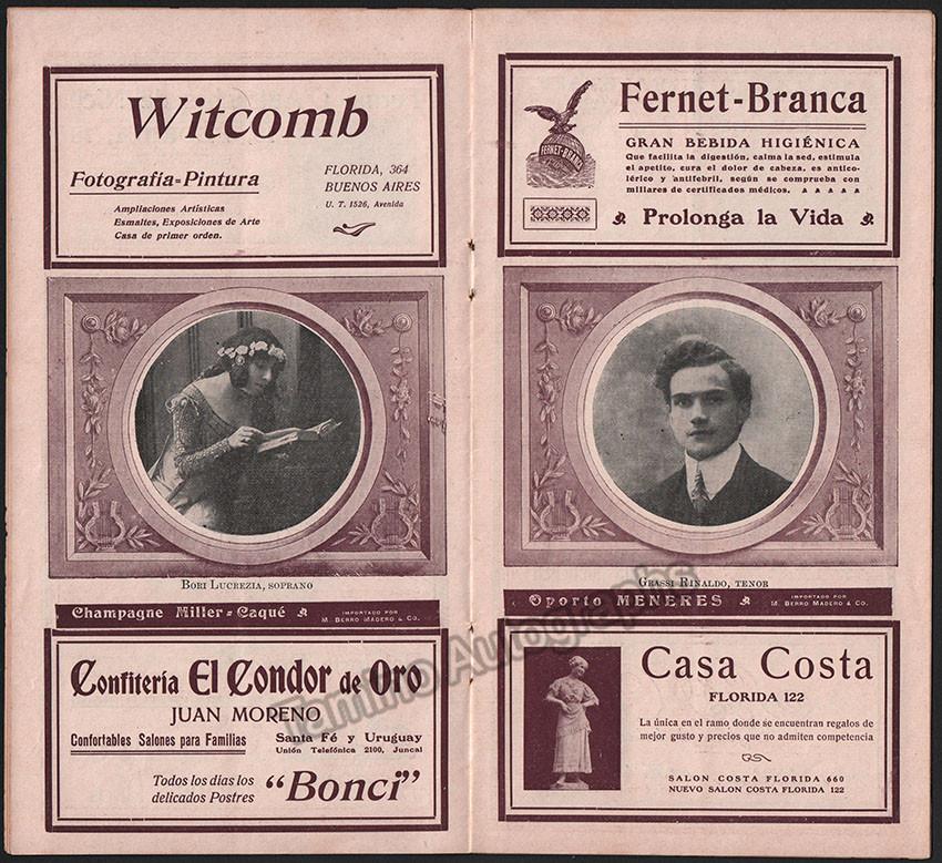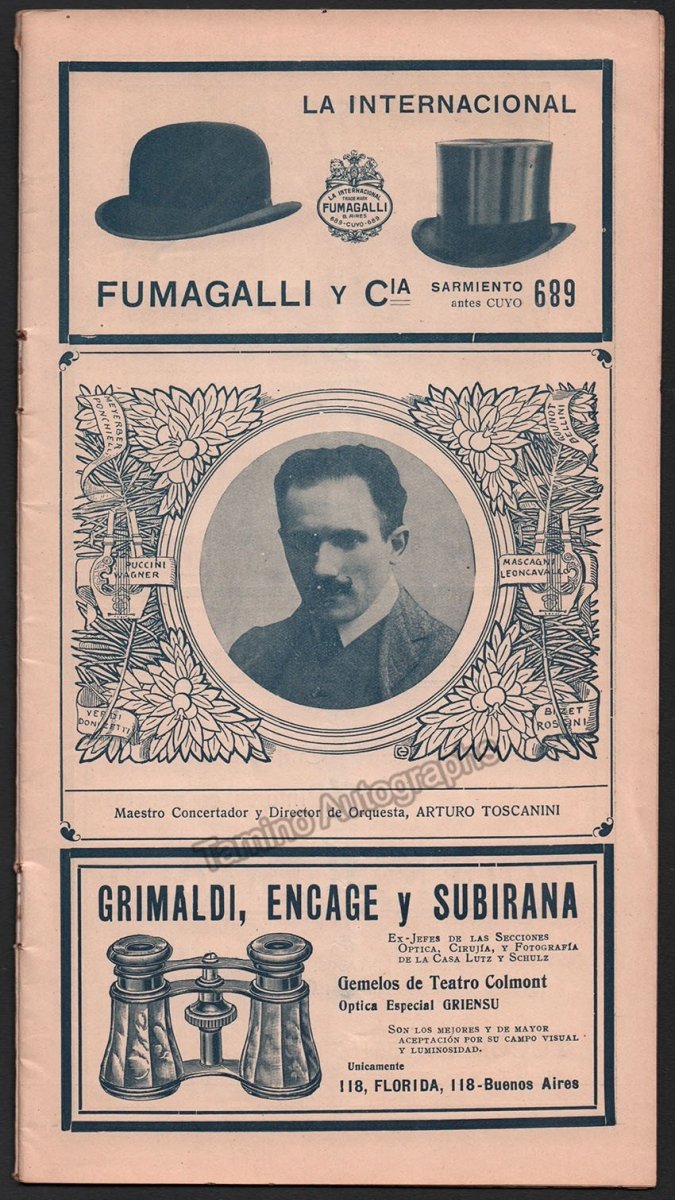 Full program for a performance of Falstaff at Teatro Colon, Buenos Aires, Argentina, conducted by Arturo Toscanini, with Pasquale Amato in the title role and Lucrezia Bori as Nanetta. Also in the cast Badini, Grassi, Garibaldi. Full program with all pages and covers, 5.5 x 10.25 inches, central pages are loose, otherwise in excellent condition.