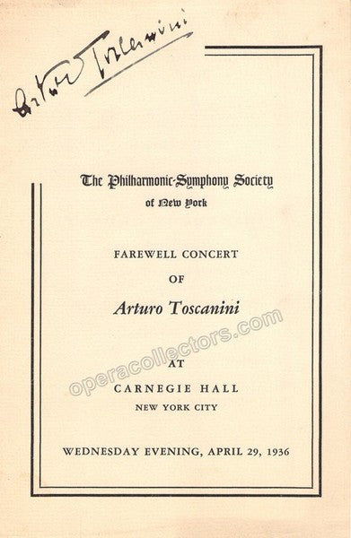 These 2 are the programs distributed for the famous concert on April 29th, 1936, Toscanini´s famous farewell to the NY Phiharmonic (then Philharmonic Symphony Society Orchestra). Includes small program, 8 pages plus covers, 6 x 9 inches, with facsimile (not real) signature on cover, plus a larger program, 8 x 10.5 inches, 14 pages plus covers. Both in excellent condition