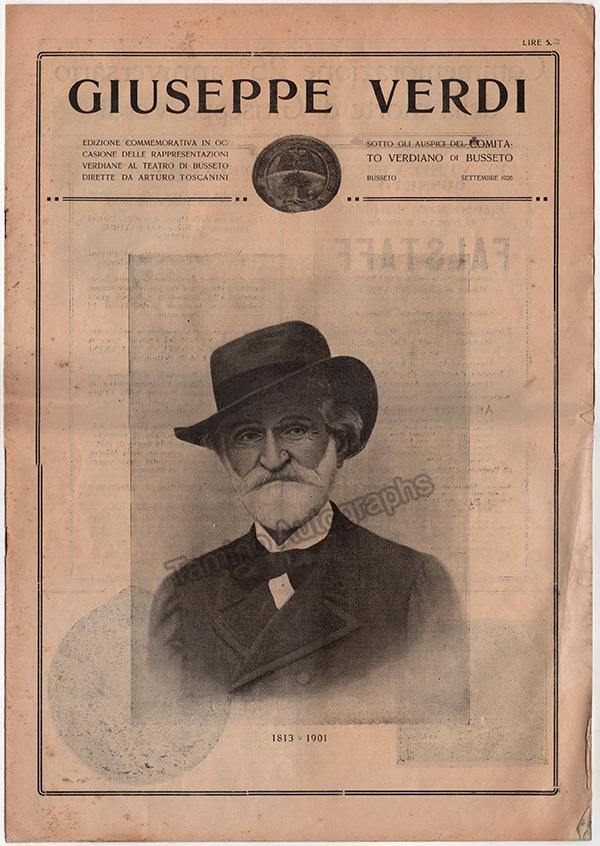 Large size program for a series of performances of Verdi's Falstaff at Teatro Verdi, Busseto, Italy, from September 4th to 20th, 1926, as an homage to the composer, conducted by the Italian conductor.  Program is in newspaper-style, full of photographs and articles related to the composer's work and life.  Size is 13.6 x 19.3 inches, 16 pages including covers, spotted rust on the front cover, tape repairs on the back, central fold, otherwise in very good condition.