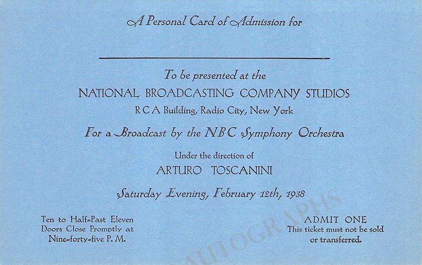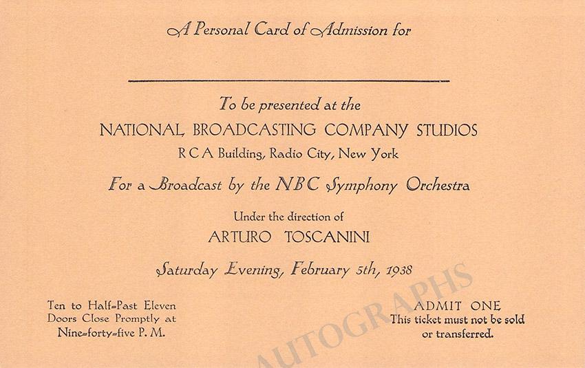 Rare program in golden cloth, for a concert by the NBC Orchestra conducted by Arturo Toscanini in 1938. One page, 6 x 8.75 inches, in excellent condition.