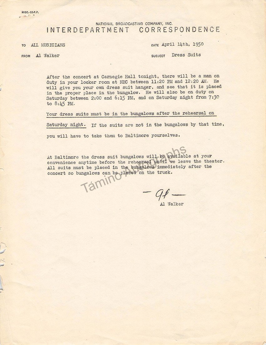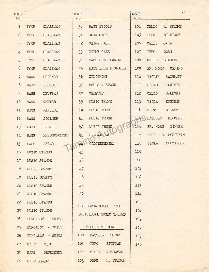 ALSO INCLUDED is a 2-page document with a list of the trunks transported by the Orchestra in their tours, including this trunk (nr. 41) for scores, a photo of Dolan with Toscanini, and a picture of an announcement sign for their tour at a train station, with a printed signature by Dolan.