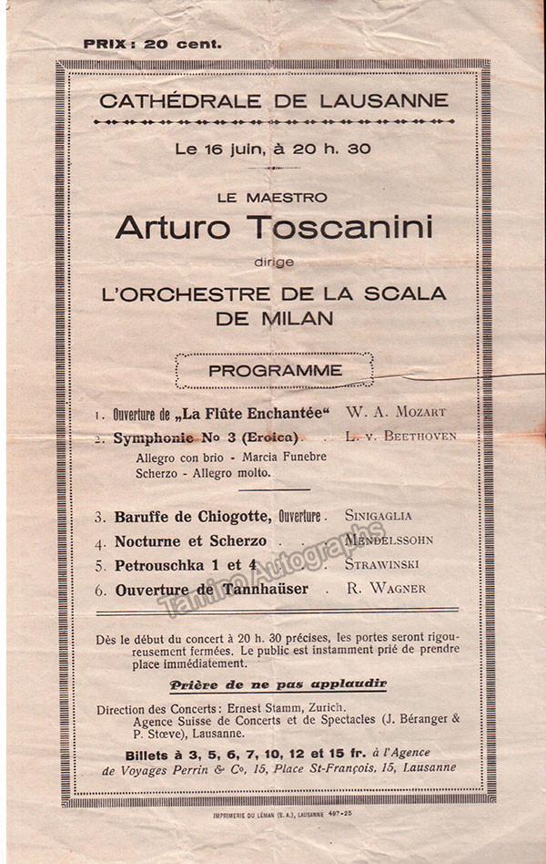 Program/playbill of a concert by Arturo Toscanini, 16 June 1925, at the Lausanne Cathedral with the La Scala Orchestra. Mozart, Beethoven, Sinigaglia, Mendelssohn, Stravinsky, Wagner.