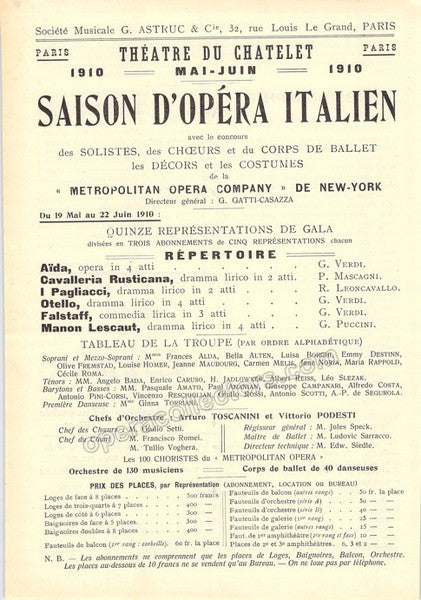 One page program for a concert at Theatre du Chatelet, Paris in 1910, with Arturo Toscanini conducting singers from the Metropolitan Opera of New York in various arias. One page, 7 x 9.5 inches, in excellent condition
