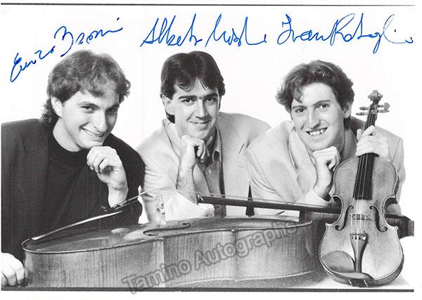 Italian ensemble founded in 1990 at the Parma Conservatory. Photo signed by all three members: Ivan Rabaglia (violin), Alberto Miodini (piano) and Enrico Bronzi (cello). Size is 7 x 5 inches, in excellent condition.
